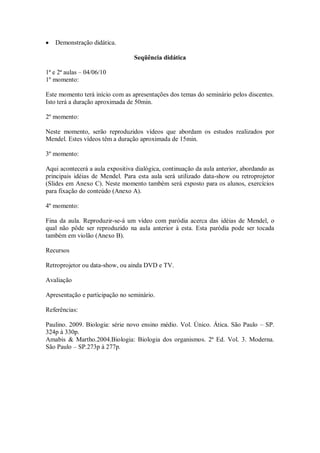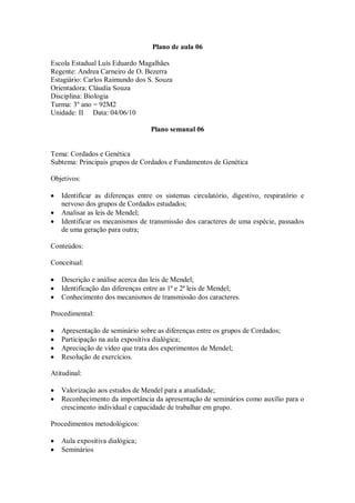 Este plano de aula aborda genética e os principais grupos de cordados. As atividades incluem seminários sobre os grupos de cordados, vídeos sobre os experimentos de Mendel, uma aula expositiva sobre genética, e exercícios para fixar o conteúdo. O objetivo é que os alunos identifiquem as diferenças entre os sistemas dos cordados e entendam as leis de Mendel e a transmissão de características.