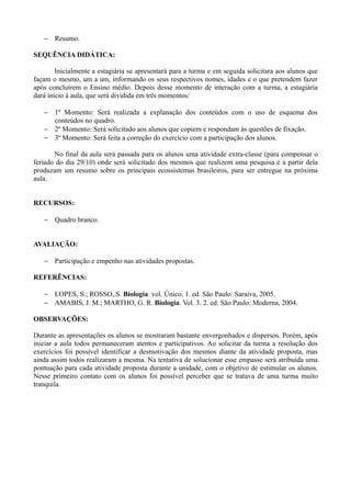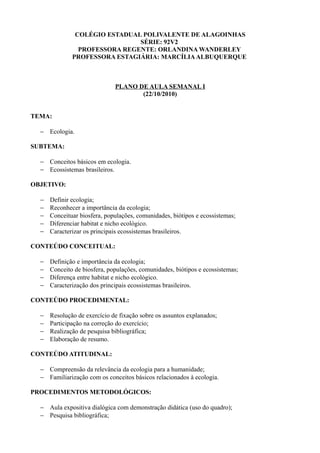 Este plano de aula semanal aborda conceitos básicos de ecologia e ecossistemas brasileiros. O objetivo é definir termos como ecologia, biosfera, populações, comunidades e ecossistemas, diferenciar habitat e nicho ecológico, e caracterizar os principais ecossistemas brasileiros. A aula será dividida em três partes: explanação dos conceitos, exercícios de fixação e correção dos exercícios.