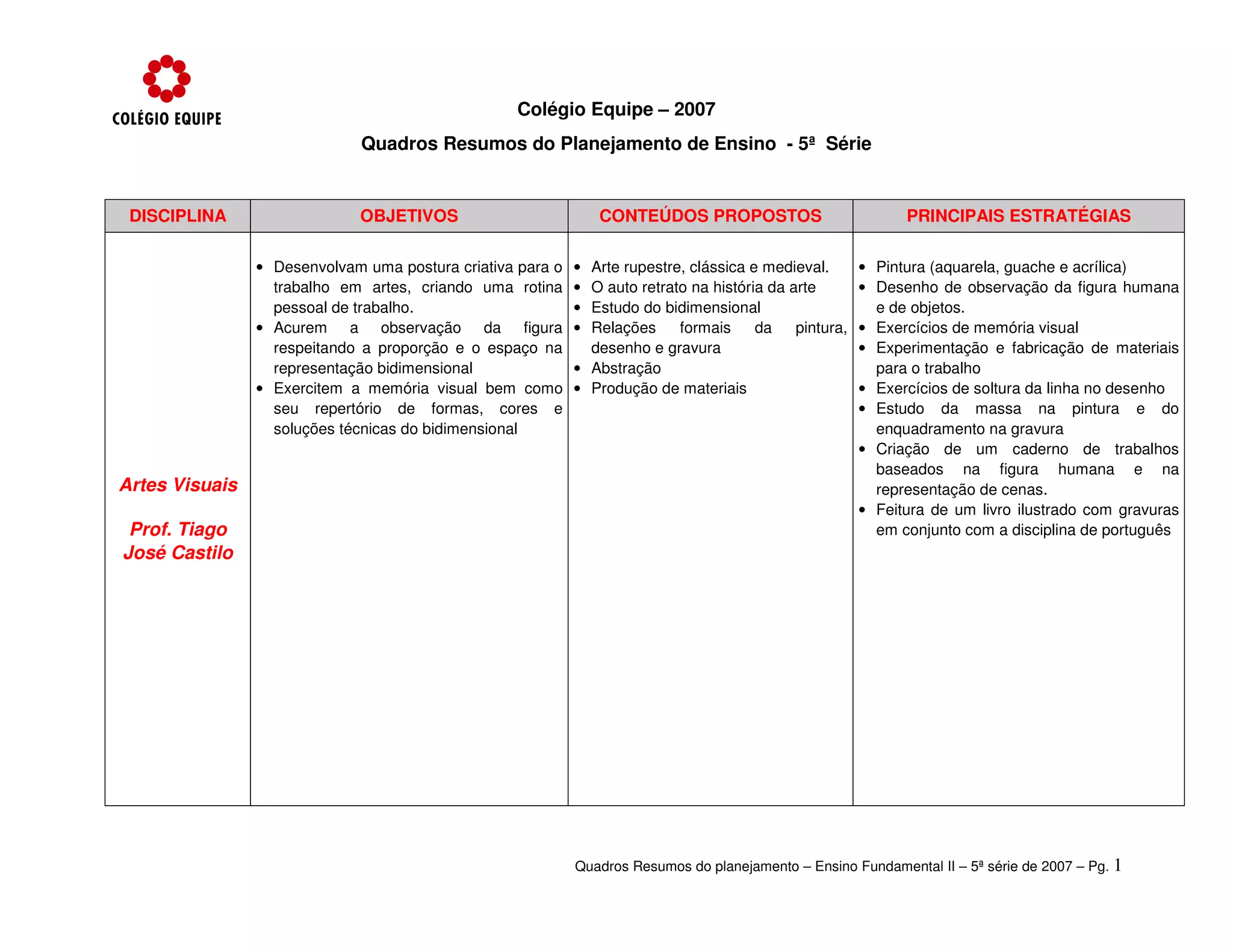 Este documento apresenta os objetivos, conteúdos e estratégias propostos para as disciplinas lecionadas na 5a série do Colégio Equipe no ano de 2007. As disciplinas incluem Artes Visuais, Ciências, Educação Física, Português, Matemática, Inglês e História. Os professores detalham os temas a serem abordados em cada trimestre letivo e as atividades que serão realizadas para alcançar os objetivos traçados para cada matéria.