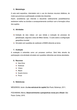O plano de aula aborda a economia mundial e objetiva identificar eventos e influências no sistema econômico global, analisar o desenvolvimento socioeconômico mundial na perspectiva da globalização e mostrar como as crises do capitalismo impactaram o setor econômico e social. Será realizada de forma expositiva com vídeos, simulados e avaliação contínua da participação dos alunos.