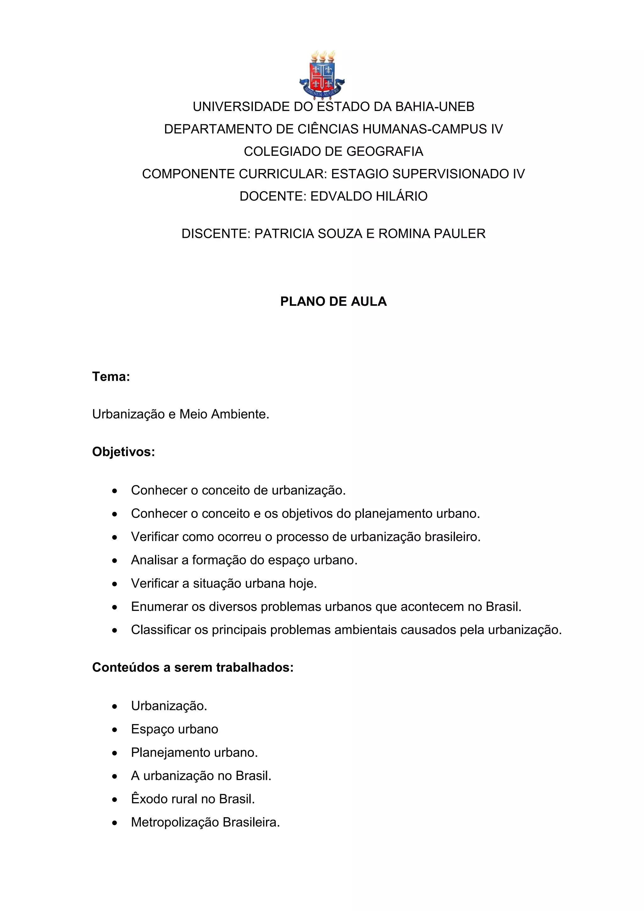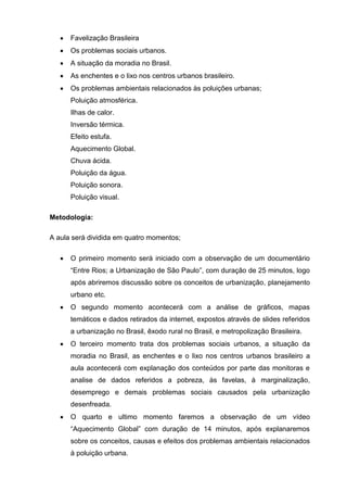 O documento apresenta um plano de aula sobre urbanização e meio ambiente. O plano inclui os seguintes objetivos: analisar o processo de urbanização brasileiro, os problemas urbanos e ambientais causados, e classificar os principais problemas ambientais causados pela urbanização. A metodologia proposta envolve a exibição de vídeos, análise de dados, e discussão sobre urbanização, problemas sociais e poluição urbana.