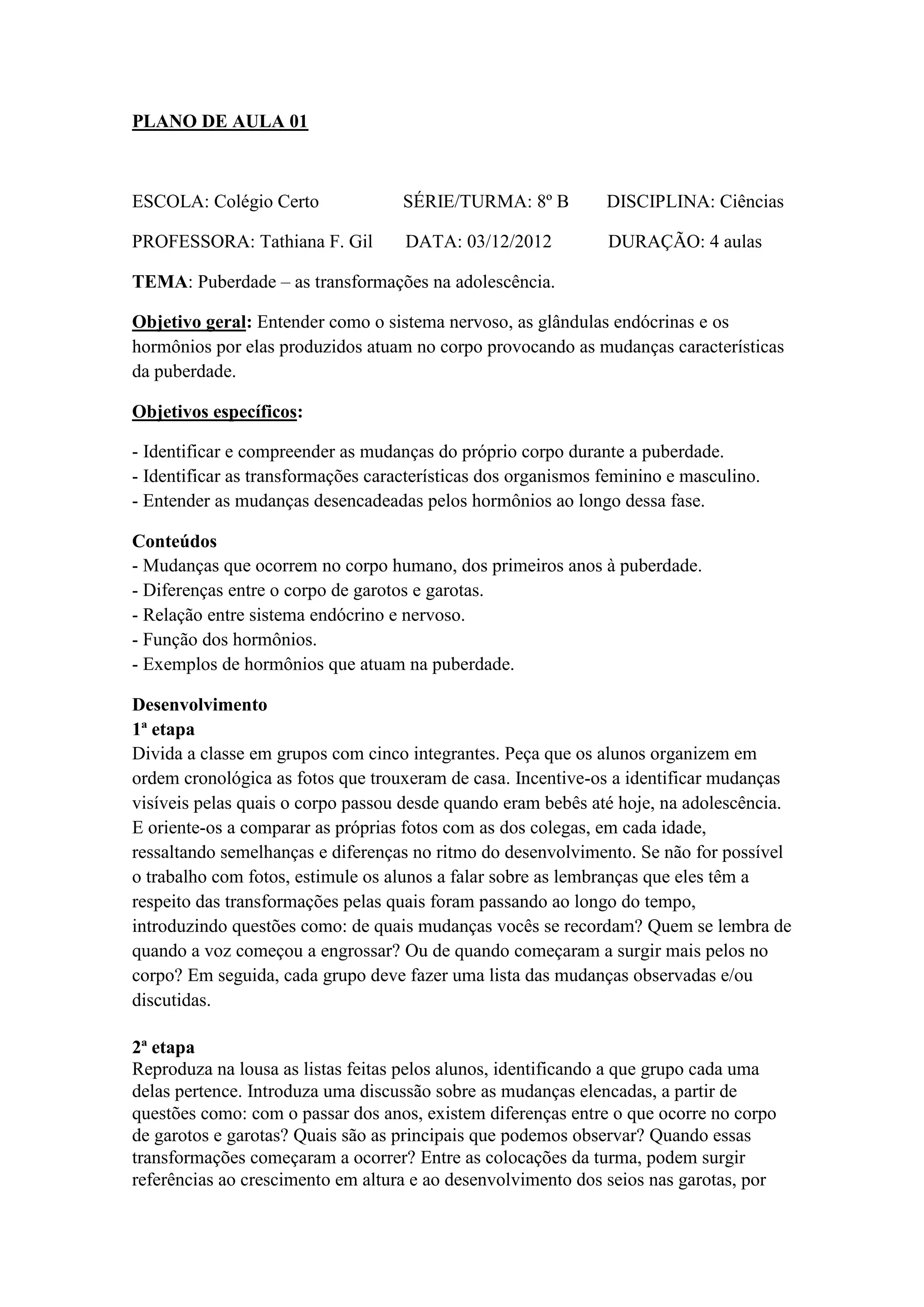 O plano de aula aborda as transformações da puberdade, incluindo mudanças físicas, hormônios e sistemas endócrino e nervoso. As atividades incluem discussões em grupo sobre mudanças no corpo, identificação de hormônios e partes do sistema endócrino, e exercícios sobre o tema.