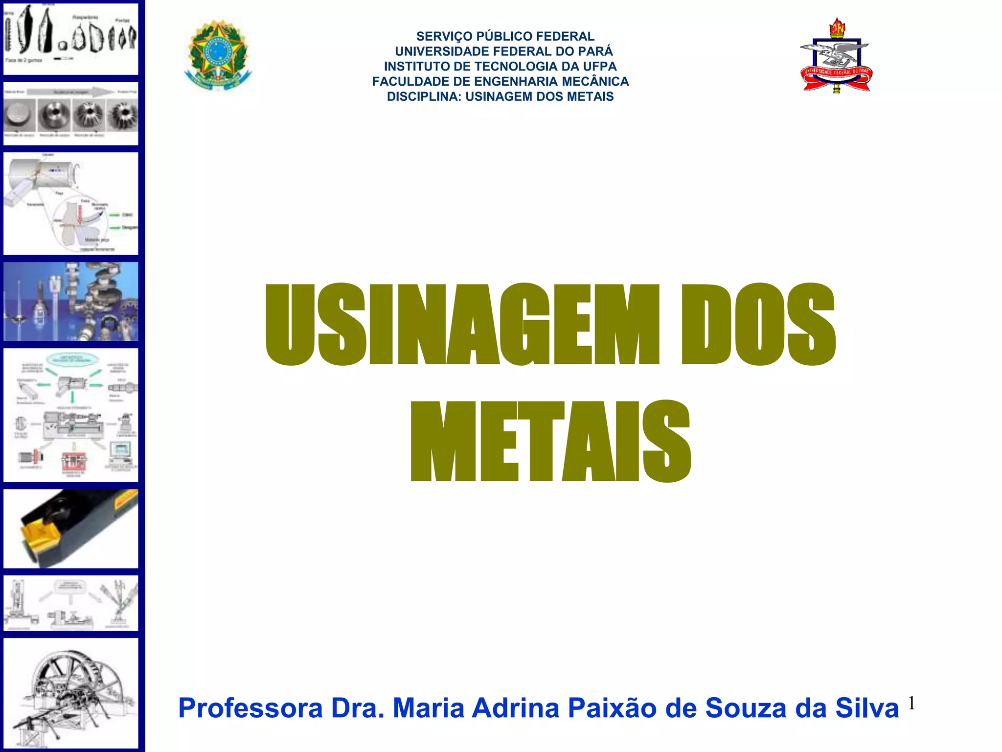 O documento apresenta detalhes sobre a disciplina de Usinagem dos Metais ministrada na Universidade Federal do Pará, incluindo identificação, importância, objetivos, ementa, programa, avaliação e bibliografias. A disciplina aborda processos e fundamentos de usinagem para fornecer conhecimentos necessários para a indústria.