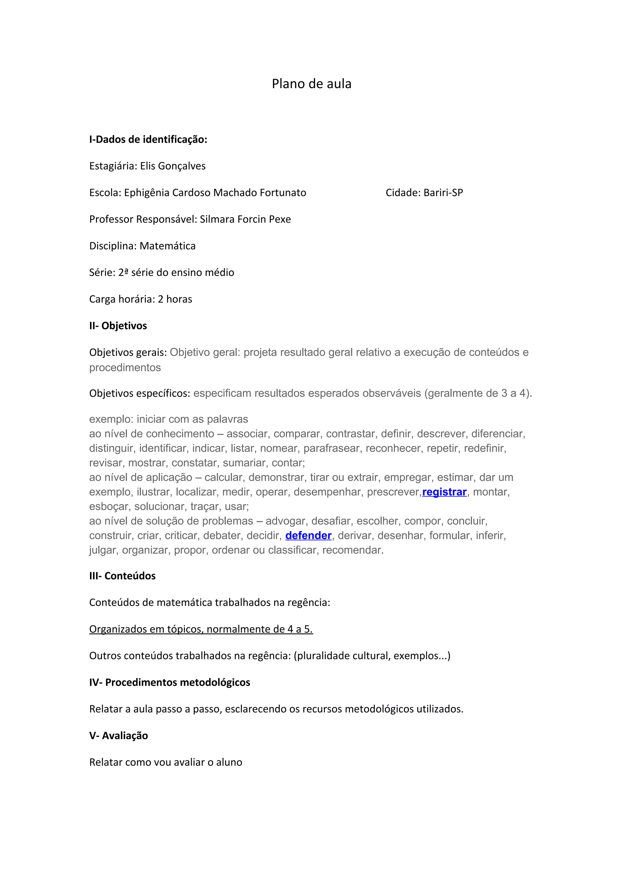 O plano de aula apresenta: 1) dados de identificação da estagiária e escola; 2) objetivos gerais e específicos da aula de matemática para o 2o ano do ensino médio; 3) conteúdos de matemática e outros conteúdos a serem trabalhados; 4) procedimentos metodológicos a serem utilizados; 5) avaliação dos alunos com atividades e critérios de correção.