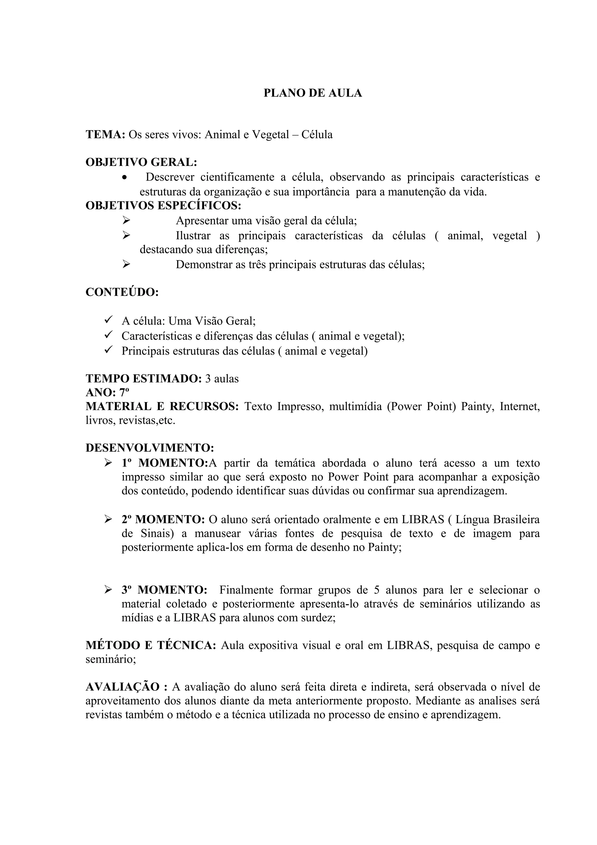 O plano de aula descreve três aulas para ensinar sobre células animais e vegetais. Os objetivos são descrever cientificamente a célula, apresentar suas características e estruturas principais, e ilustrar as diferenças entre células animais e vegetais. As aulas incluem uma visão geral da célula, características e diferenças das células, e as principais estruturas das células.