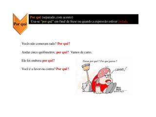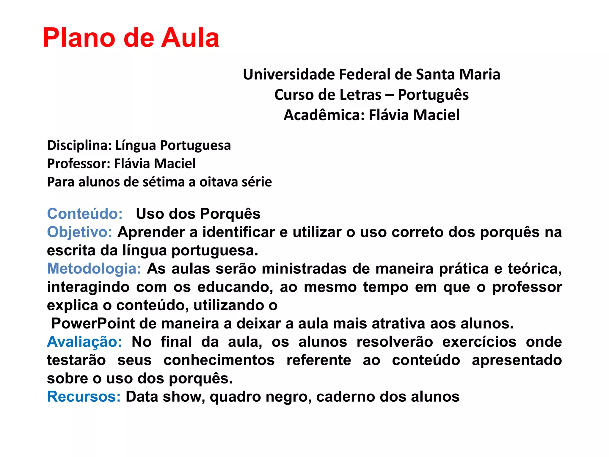 Este plano de aula aborda o uso correto dos porquês na escrita da língua portuguesa para alunos de sétima a oitava série. A professora utilizará apresentações PowerPoint de forma interativa com os alunos para explicar o conteúdo de maneira prática e teórica. Uma avaliação com exercícios será aplicada no final para verificar o aprendizado dos alunos sobre o tema.