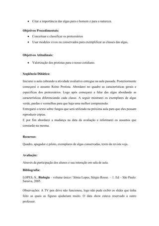 Este documento apresenta o plano de aula de uma professora estagiária sobre o tema "Reino Protista". O objetivo geral é compreender a diversidade dos protistas com características semelhantes aos animais. A aula abordará as características gerais e específicas dos protozoários e das algas, mostrando exemplos conservados. A avaliação será feita por meio da participação dos alunos em sala de aula.