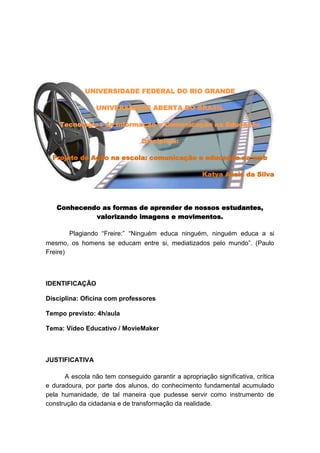 Este documento propõe que os professores criem vídeos educativos utilizando o Movie Maker para suas disciplinas. Os vídeos deverão ser postados no Youtube e o link enviado aos alunos para que possam acessá-los. A avaliação será feita com base na análise das produções dos professores.