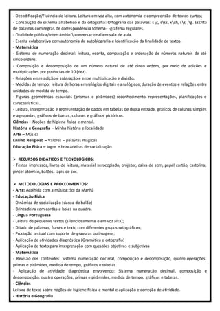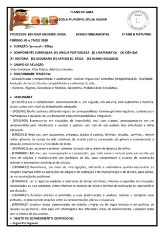 Este plano de aula descreve as atividades semanais para a disciplina de Português, Matemática, Ciências, História, Geografia, Arte, Educação Física e Ensino Religioso para alunos do 5o ano. Inclui os objetivos de aprendizagem, habilidades, conteúdos, recursos, metodologias e avaliação para cada disciplina ao longo de duas semanas.