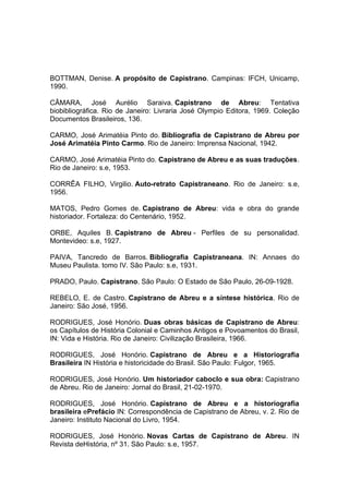 Este plano de aula aborda a vida e obra do historiador brasileiro Capistrano de Abreu através de uma lista de referências bibliográficas sobre o tema. As referências incluem livros, artigos e prefácios que discutem a biografia, a produção acadêmica e a influência de Capistrano de Abreu na historiografia brasileira.