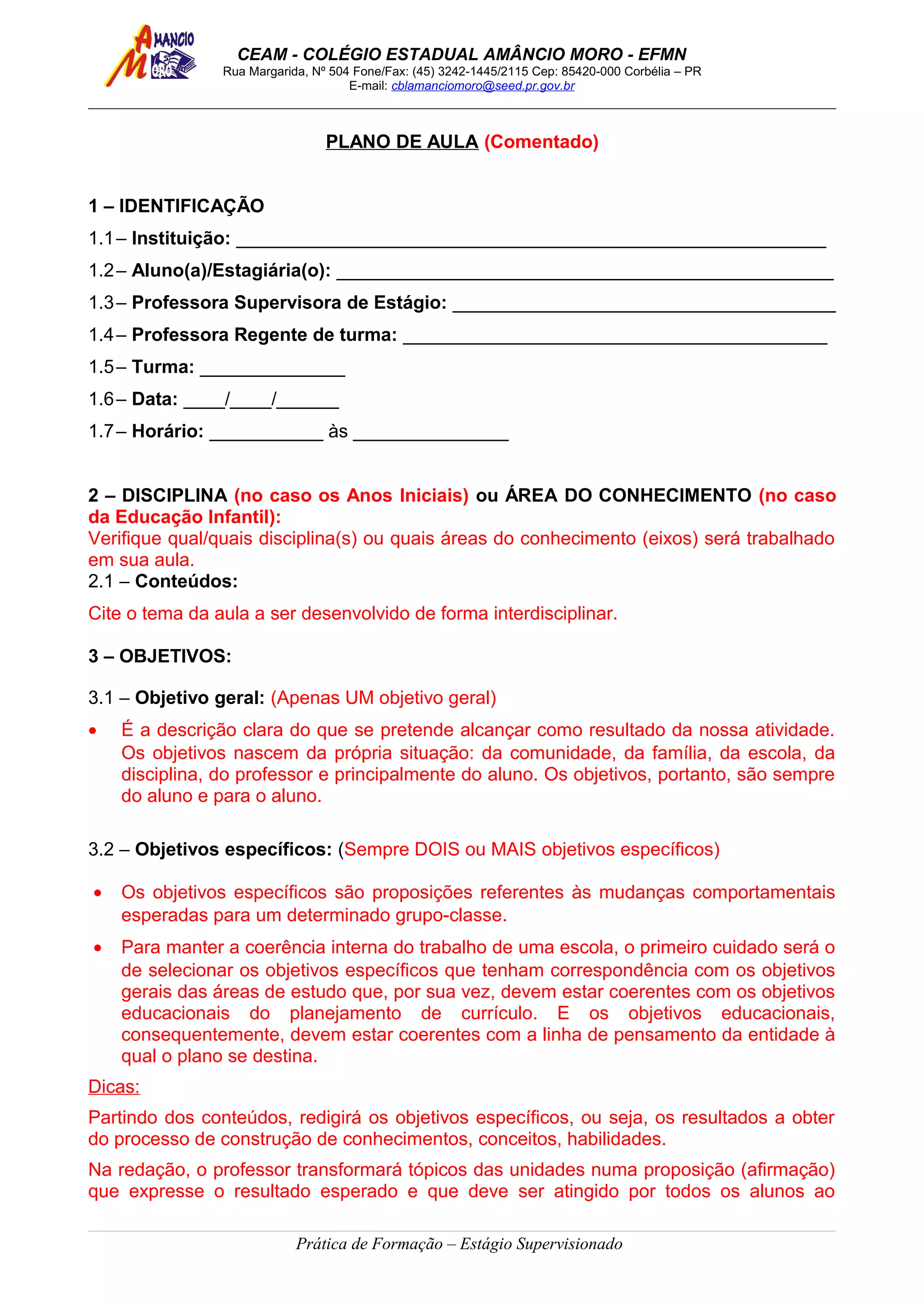 O documento apresenta um modelo de plano de aula para professores estagiários, contendo seções para identificação da aula, objetivos, conteúdos, metodologia, recursos, avaliação e referências. O plano de aula é um guia para organizar e desenvolver as atividades de ensino de forma sistematizada.