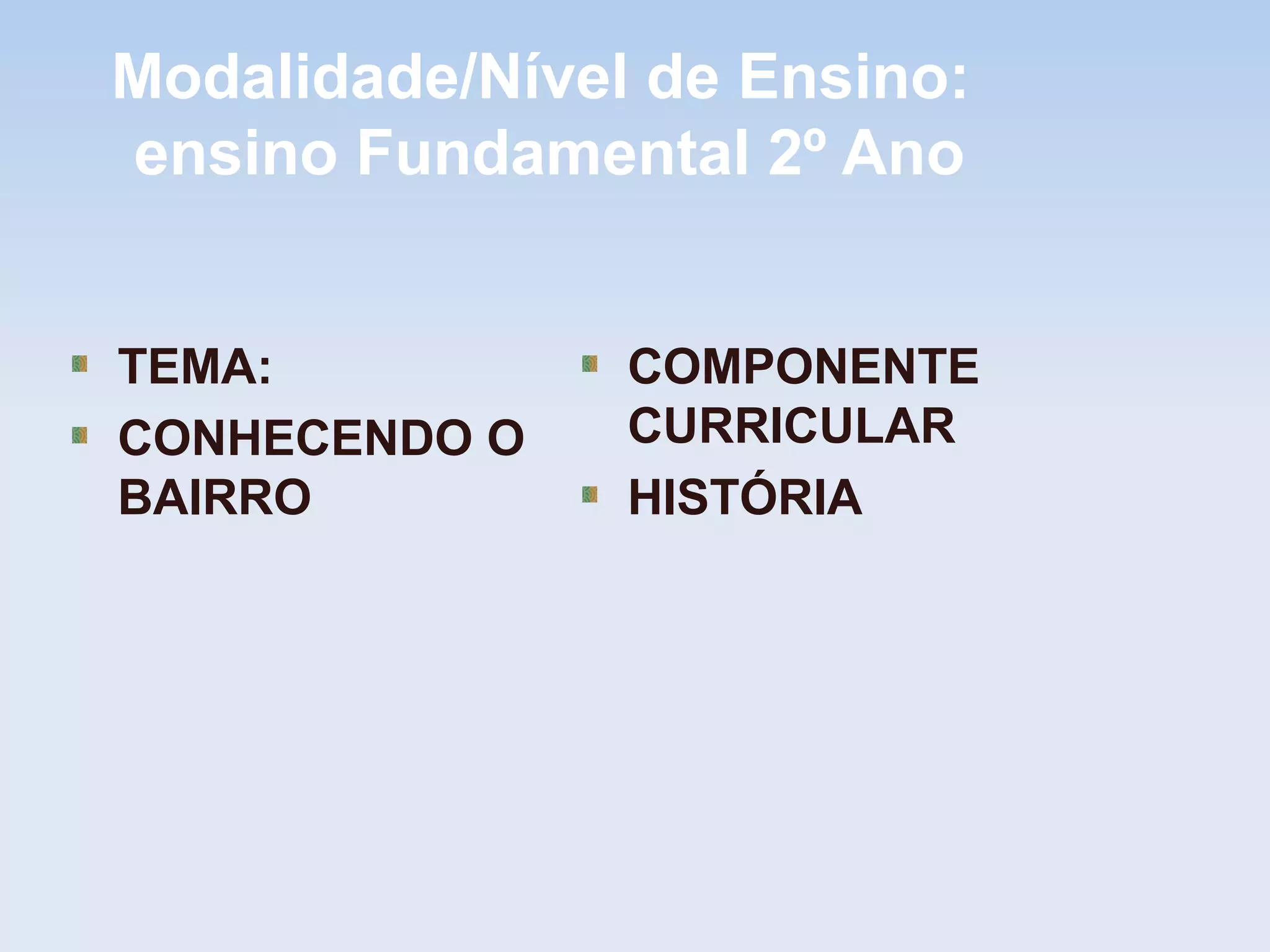 Este documento fornece informações sobre uma lição para alunos do 2o ano do ensino fundamental sobre conhecer o bairro onde moram. A lição ensina as crianças a identificar o nome do seu bairro, ruas, avenidas, comércios locais e o que há no bairro. A metodologia envolve perguntar às crianças sobre o nome do seu bairro e o que contém, e os recursos incluem pesquisa na internet e materiais para atividades manuais.