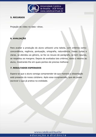 O plano de aula tem como objetivo ensinar aos alunos do 9o ano como extrair elementos de um vídeo para elaborar uma dissertação. A aula abordará a estrutura da dissertação, com foco na argumentação, e usará um vídeo e discussão para mostrar como a argumentação é usada no cotidiano e em textos. A avaliação será feita com base em critérios formais da redação para fornecer feedback aos alunos.