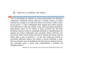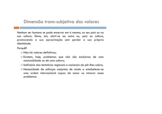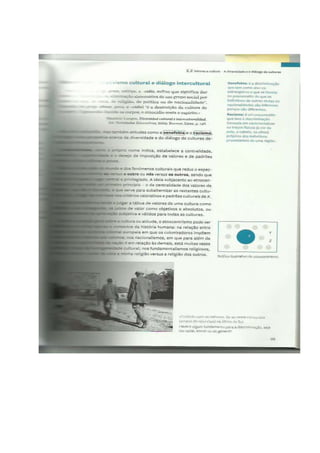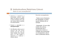 Este documento apresenta os objetivos, conteúdos e metodologia de duas aulas de Filosofia sobre valores e cultura para alunos do 10o ano. As aulas visam analisar diferentes atitudes face à diversidade cultural, como etnocentrismo, multiculturalismo e interculturalidade, e refletir sobre a importância do diálogo intercultural.