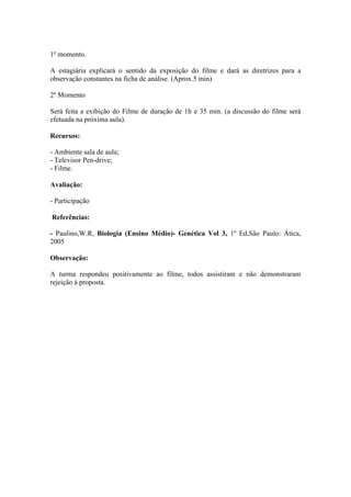 O documento descreve o plano de aula de Biologia sobre conceitos básicos de genética. O tema aborda DNA, RNA, genes e cromossomos. Os objetivos são identificar o papel do DNA e RNA como materiais hereditários e analisar a engenharia genética. A aula apresentará o filme GATTACA e inclui discussão sobre suas implicações.