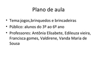 O documento discute a importância das brincadeiras, jogos e brinquedos no desenvolvimento das crianças. Ele destaca que as brincadeiras tradicionais ajudam a preservar a cultura e promovem a interação entre gerações. Além disso, o brincar estimula a imaginação, favorece a socialização e o raciocínio lógico das crianças.