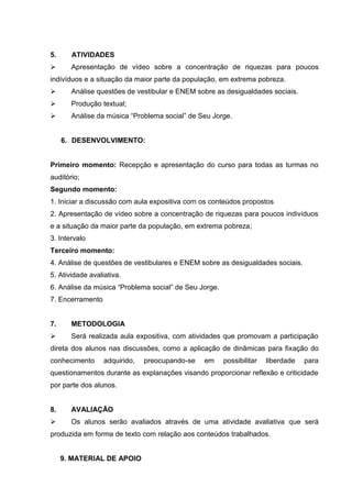 O plano de aula aborda as desigualdades e contradições no espaço como uma realidade histórica. O objetivo é explicar a origem das desigualdades sociais, promover diálogos sobre a sociedade brasileira atual e comparar grupos e classes sociais. As atividades incluem vídeos, análise de questões e produção textual.