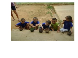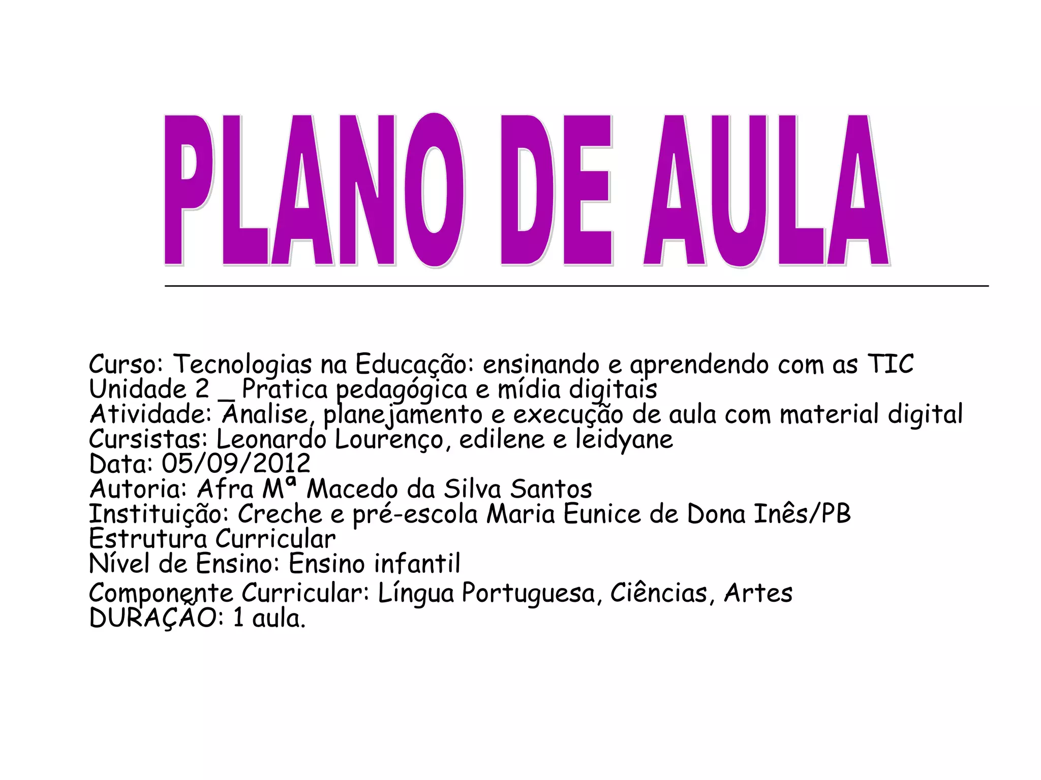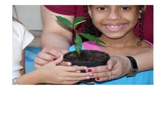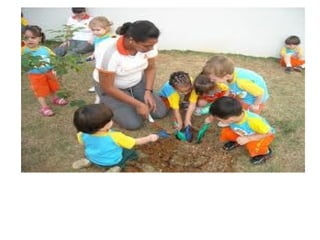 A aula aborda o tema "Meio Ambiente" e tem como objetivos integrar as crianças em atividades em grupo, desenvolver atenção e concentração, assistir um vídeo sobre meio ambiente, criar brinquedos com sucata e compreender a importância da preservação ambiental. As atividades incluem assistir vídeo, contar histórias, plantar mudas e dançar.