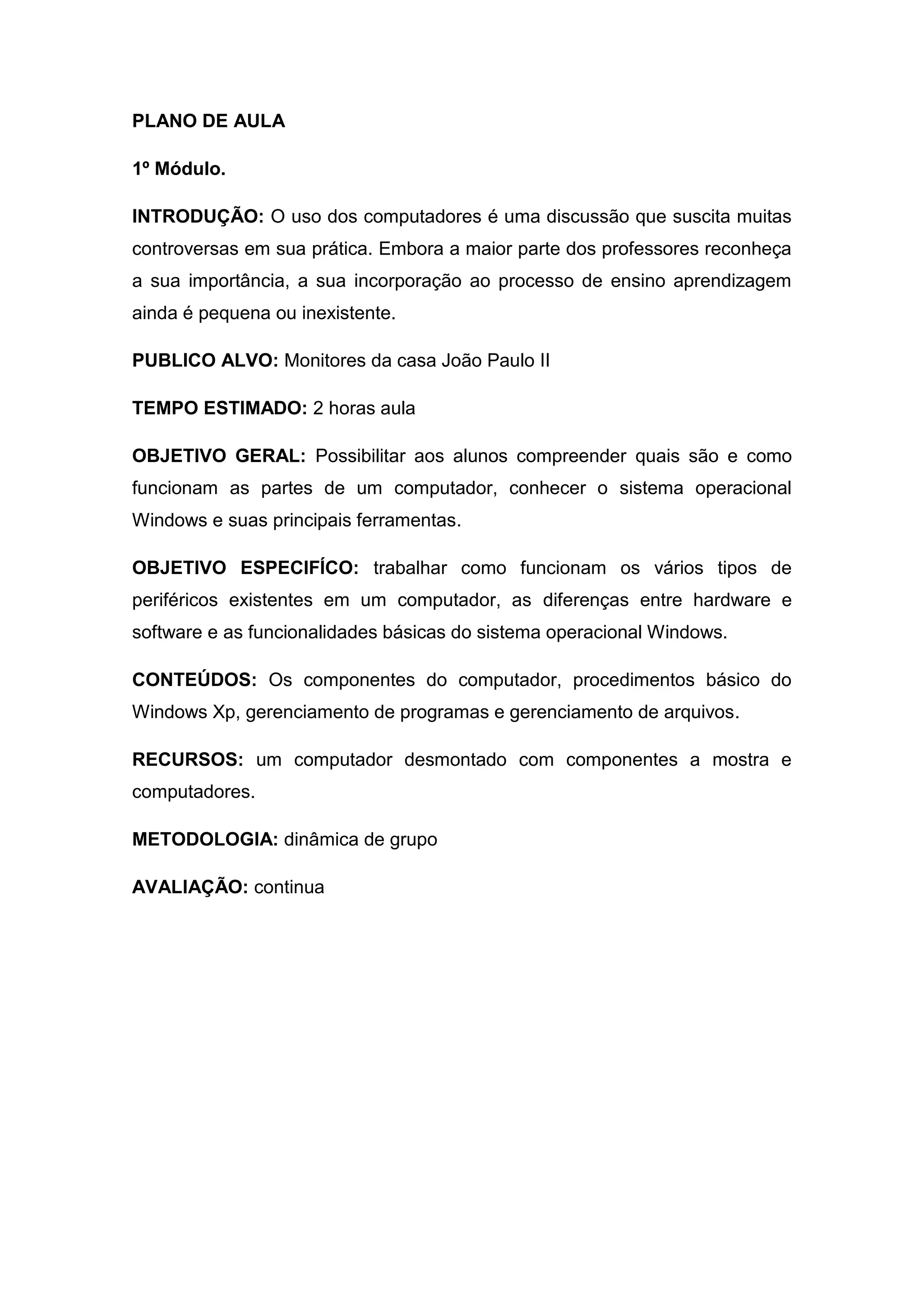 Este plano de aula visa ensinar monitores sobre os componentes básicos de um computador, o sistema operacional Windows e suas ferramentas principais. O objetivo geral é possibilitar aos alunos compreender as partes de um computador e como funcionam, enquanto os objetivos específicos incluem trabalhar com periféricos, hardware, software e funcionalidades básicas do Windows. Os conteúdos a serem abordados são componentes do computador, procedimentos básicos do Windows XP e gerenciamento de programas e arquivos.