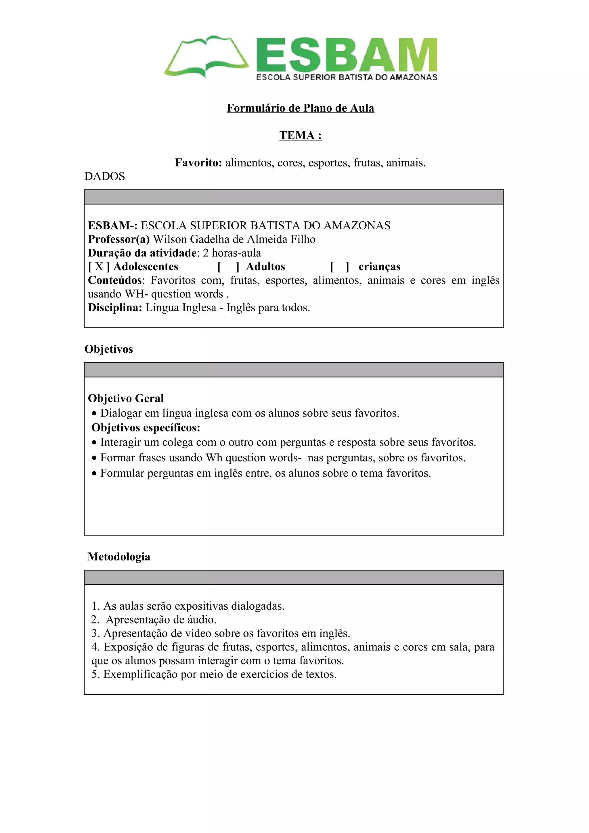 Este plano de aula trata sobre o tema "favoritos" em inglês. O objetivo geral é dialogar sobre favoritos como comida, frutas, esportes, animais e cores usando palavras interrogativas em inglês. As atividades incluem áudio, vídeo, figuras e exercícios de texto para interagir sobre os favoritos. A aula será avaliada pela participação dos alunos.