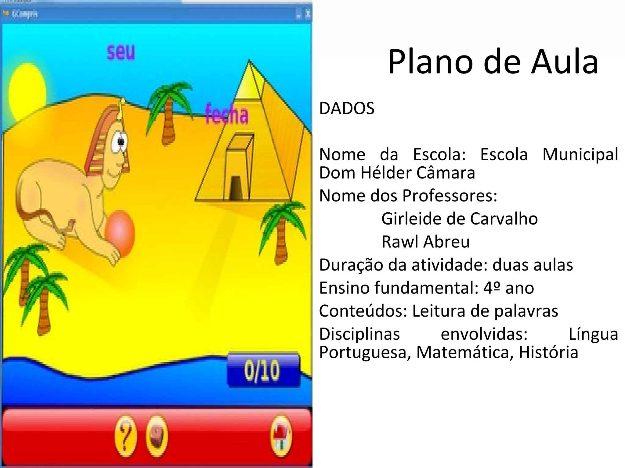 Este plano de aula tem como objetivo ampliar o repertório de leitura de palavras de alunos do 4o ano do ensino fundamental. As atividades incluem a exploração do software educacional Gcompris para identificar letras, sílabas e palavras, digitação das palavras no teclado do computador e produção de um texto sobre a experiência.
