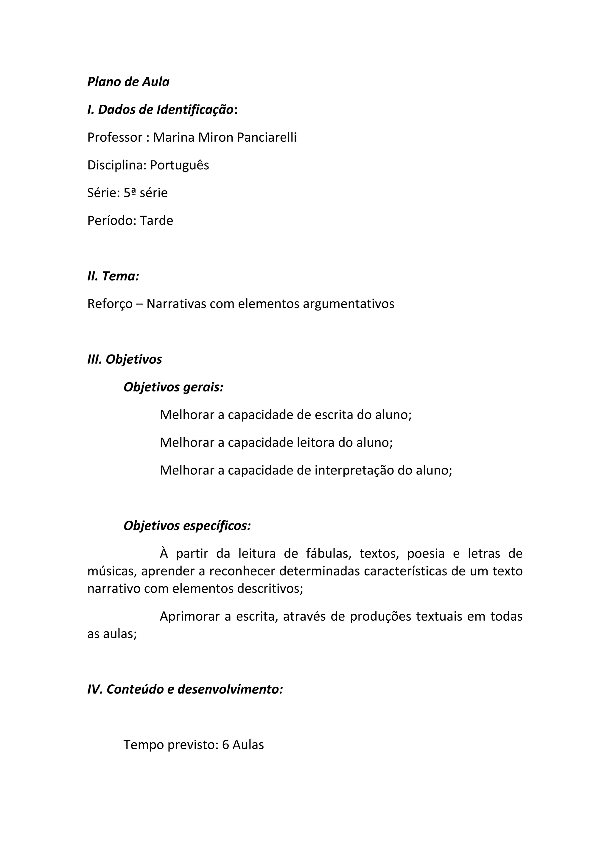 Este plano de aula visa melhorar as habilidades de escrita, leitura e interpretação de texto de alunos do 5o ano através de 6 aulas focadas em narrativas com elementos argumentativos e descritivos. As aulas incluem análise de músicas, poesias e histórias em quadrinhos, além de produção de textos narrativos pelos alunos.