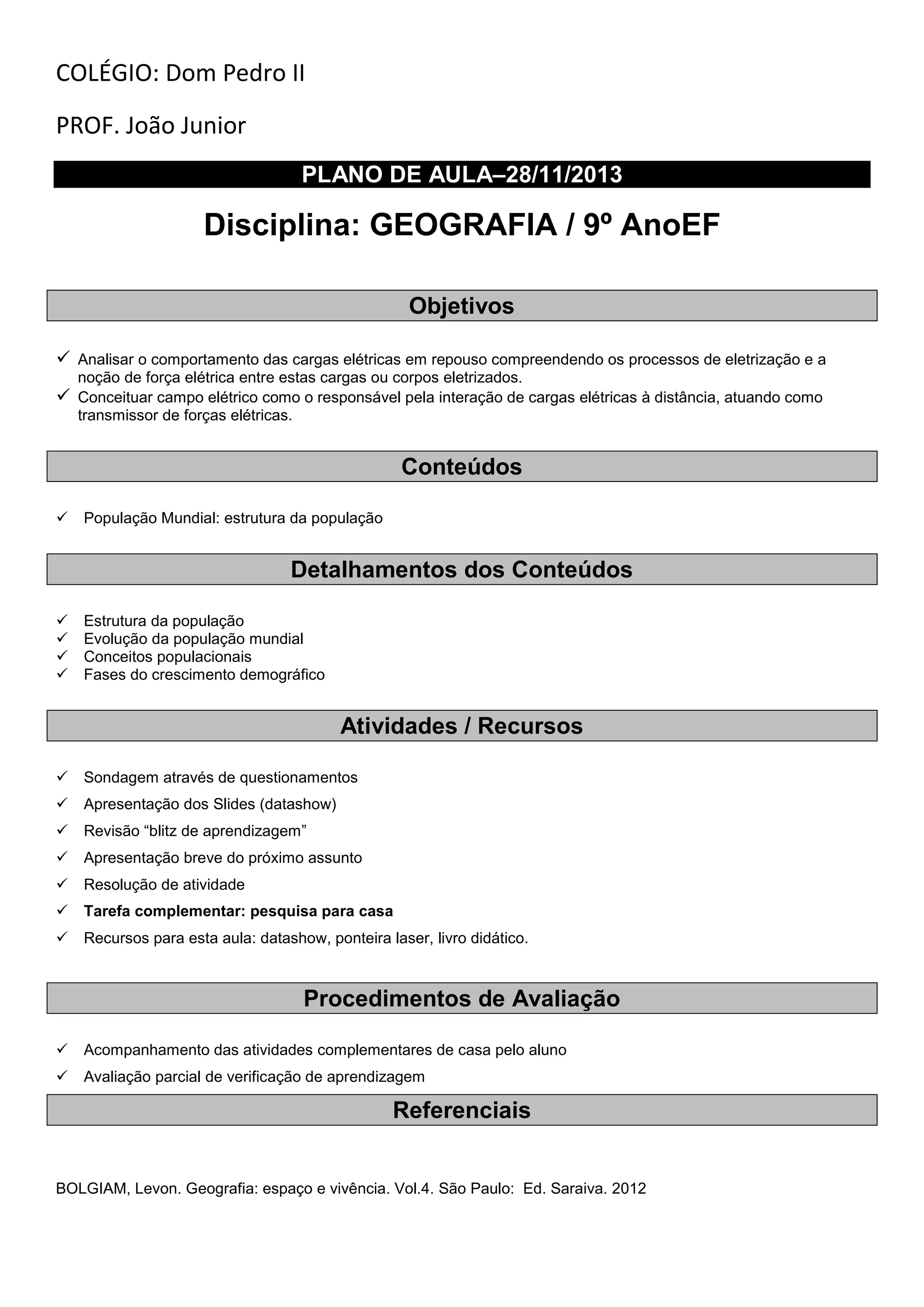 O plano de aula trata da disciplina de Geografia para o 9o ano do Colégio Dom Pedro II. O professor João Junior irá ensinar sobre a população mundial, incluindo a estrutura da população, evolução da população mundial e conceitos populacionais. As atividades incluem questionamentos, apresentação de slides, resolução de atividades e pesquisa para casa.