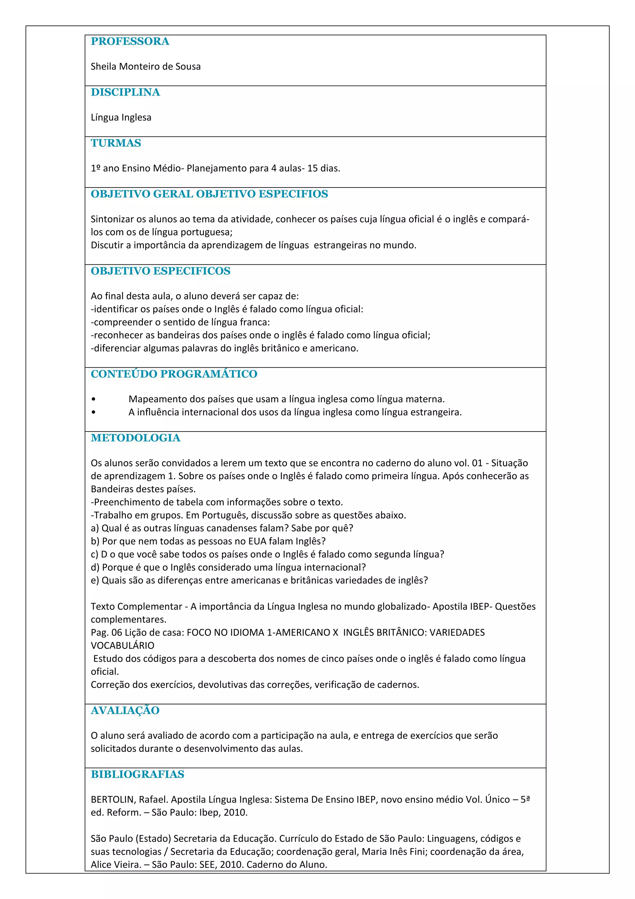 Este documento apresenta o planejamento de 4 aulas de Língua Inglesa para alunos do 1o ano do Ensino Médio. O objetivo geral é familiarizar os alunos com os países onde o inglês é a língua oficial e a importância do aprendizado de línguas estrangeiras. As aulas abordarão os países de língua inglesa, suas bandeiras, o inglês como língua franca e as diferenças entre inglês britânico e americano. A avaliação dos alunos se dará por me