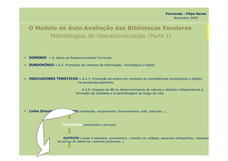 O documento descreve o Modelo de Auto-Avaliação das Bibliotecas Escolares, incluindo os domínios, subdomínios e indicadores temáticos a serem avaliados. Ele fornece orientações sobre como operacionalizar a auto-avaliação, incluindo a recolha de dados, análise, identificação de necessidades e comunicação dos resultados. O objetivo é avaliar o desempenho da biblioteca e identificar áreas para melhoria contínua.