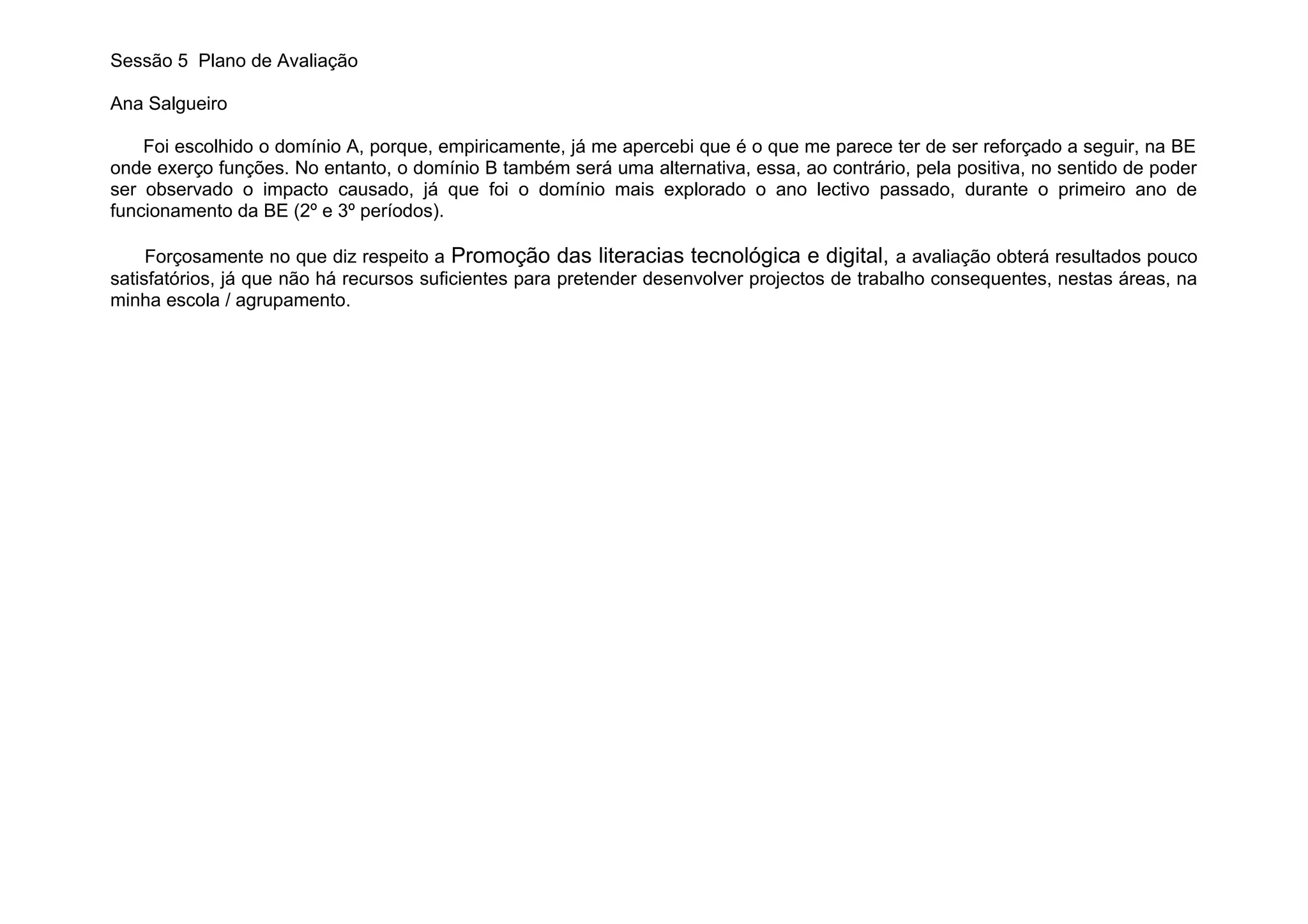 Este documento apresenta o plano de avaliação de Ana Salgueiro para a Biblioteca Escolar. O foco será nos domínios A e B, analisando o impacto causado no ano anterior no domínio B e reforçando o domínio A. A avaliação das literacias tecnológicas e digitais terá resultados pouco satisfatórios devido à falta de recursos. Serão desenvolvidas atividades para promover as literacias da informação, tecnológica e digital entre alunos e professores.