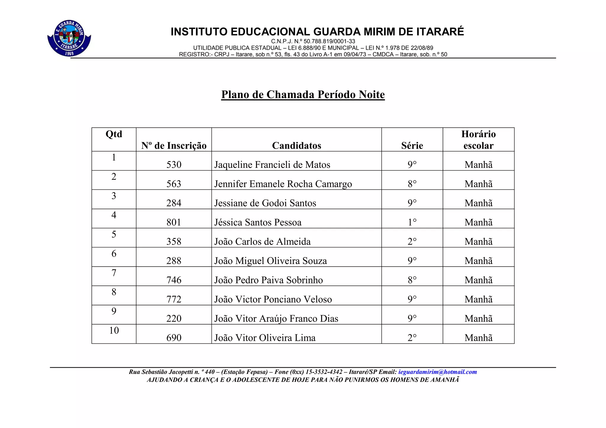 O documento é uma lista de chamada de alunos do Instituto Educacional Guarda Mirim de Itararé, contendo nome, número de inscrição, série e turno de cada aluno. A lista inclui informações sobre a instituição como CNPJ, endereço e objetivo de ajudar crianças e adolescentes.