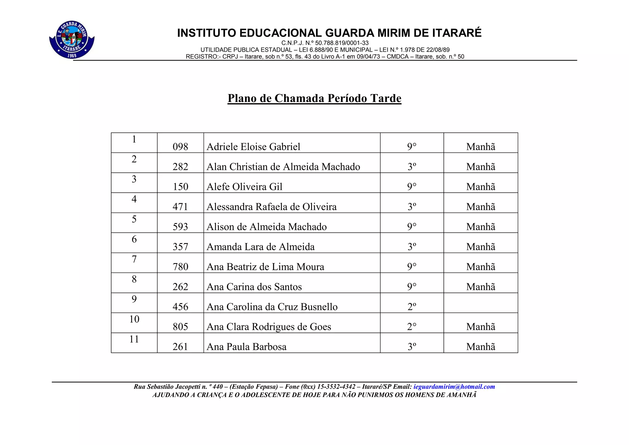 Este documento é uma lista de presença de alunos do Instituto Educacional Guarda Mirim de Itararé, contendo nome, série e turno de cada aluno. A lista inclui informações sobre a instituição como CNPJ, endereço e objetivo de ajudar crianças e adolescentes.