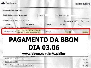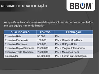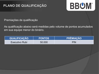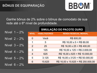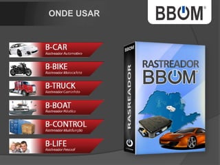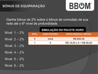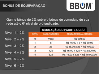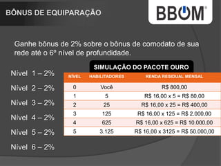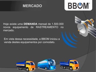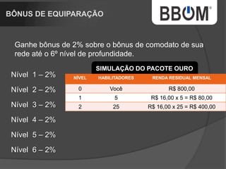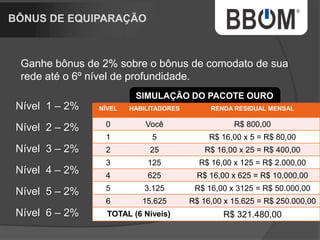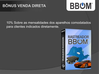 1. O documento descreve uma empresa de rastreamento de veículos chamada BBOM que oferece diferentes pacotes de rastreamento e um plano de marketing multinível para distribuidores. 2. A empresa está expandindo para um novo prédio e tem como objetivo rastrear uma parcela maior da frota nacional de veículos. 3. O plano de marketing multinível oferece renda residual aos distribuidores de acordo com o número de pessoas recrutadas e níveis alcançados.