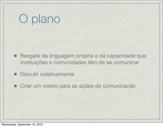 O documento apresenta um plano de comunicação comunitária com os seguintes objetivos: (1) resgatar a linguagem própria das comunidades e instituições para comunicação; (2) discutir coletivamente e criar um roteiro de ações de comunicação; (3) divulgar o trabalho da entidade usando princípios do jornalismo para estimular debate e democratizar informação.