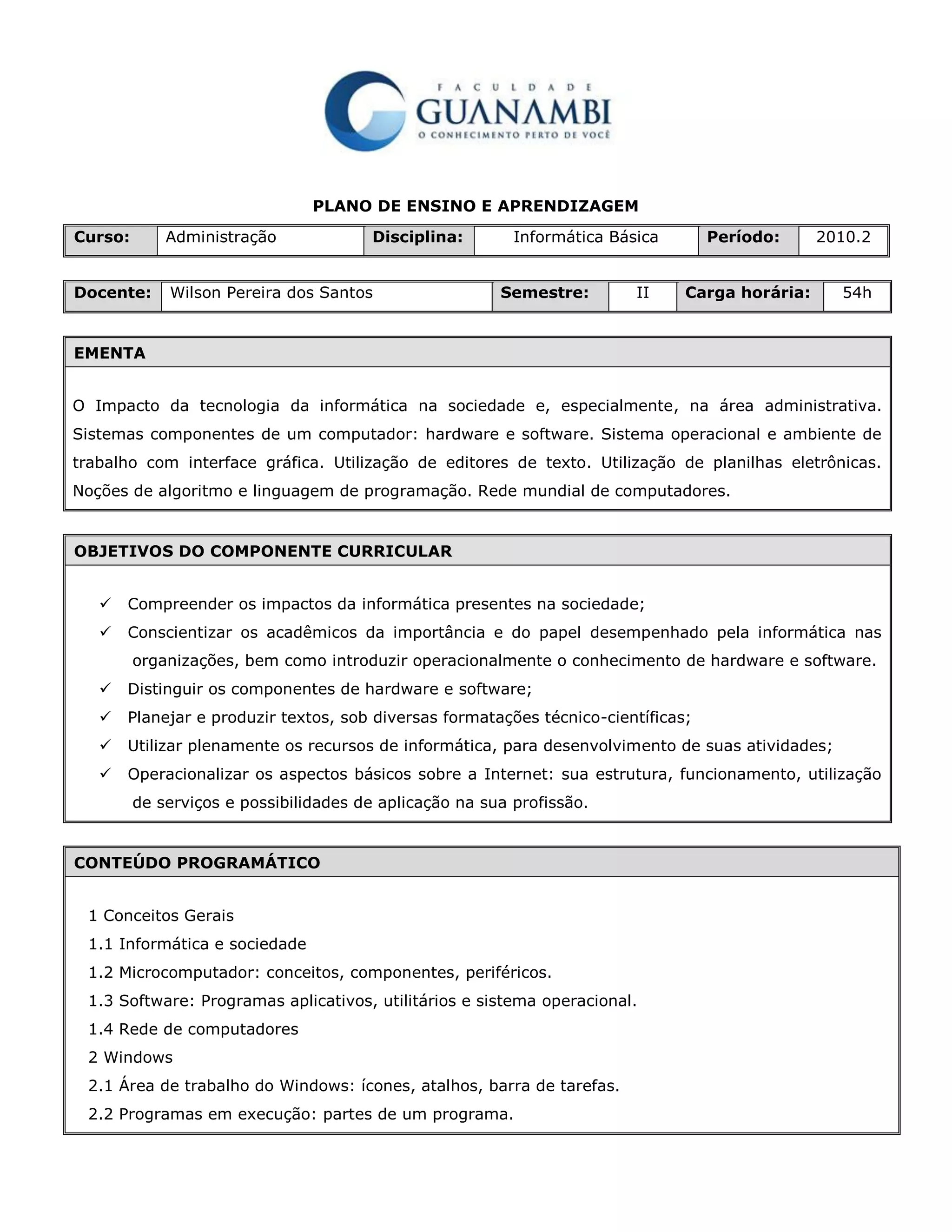 Este plano de ensino descreve uma disciplina de Informática Básica para estudantes de Administração. O curso irá ensinar conceitos básicos de hardware, software, sistemas operacionais e aplicativos como Word, Excel e PowerPoint. Os alunos aprenderão a usar esses aplicativos para produzir documentos, planilhas e apresentações.