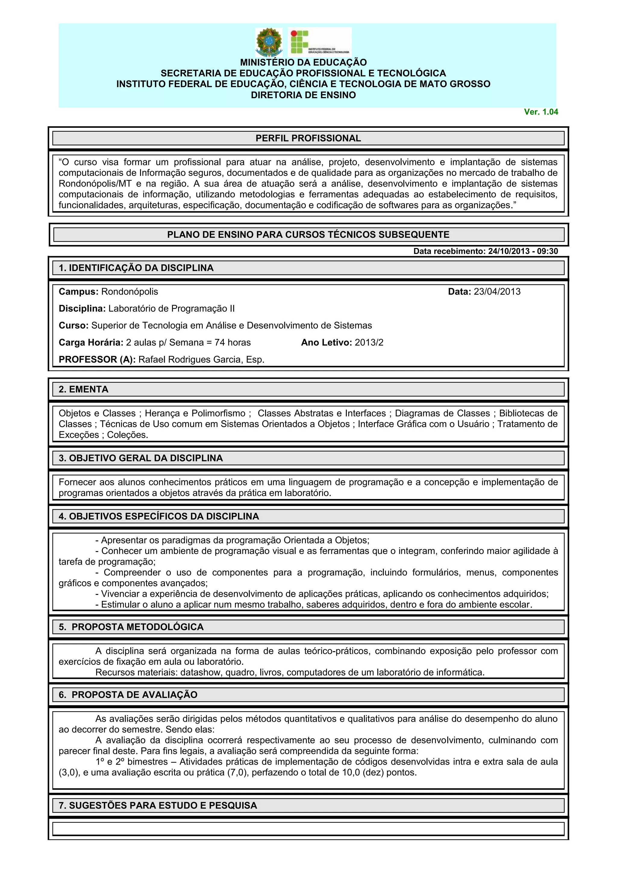 Este documento descreve o plano de ensino para a disciplina de Laboratório de Programação II no curso de Análise e Desenvolvimento de Sistemas do Instituto Federal de Educação, Ciência e Tecnologia de Mato Grosso. O plano inclui três unidades de ensino cobrindo programação orientada a objetos, ambiente de desenvolvimento integrado e programação gráfica.