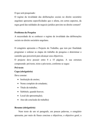 O documento apresenta um plano de estágio para pesquisar o regime da invalidade das deliberações sociais no direito societário angolano. O plano inclui uma introdução ao tema, revisão da literatura, metodologia de trabalho e cronograma, além de orientações para o estágio.