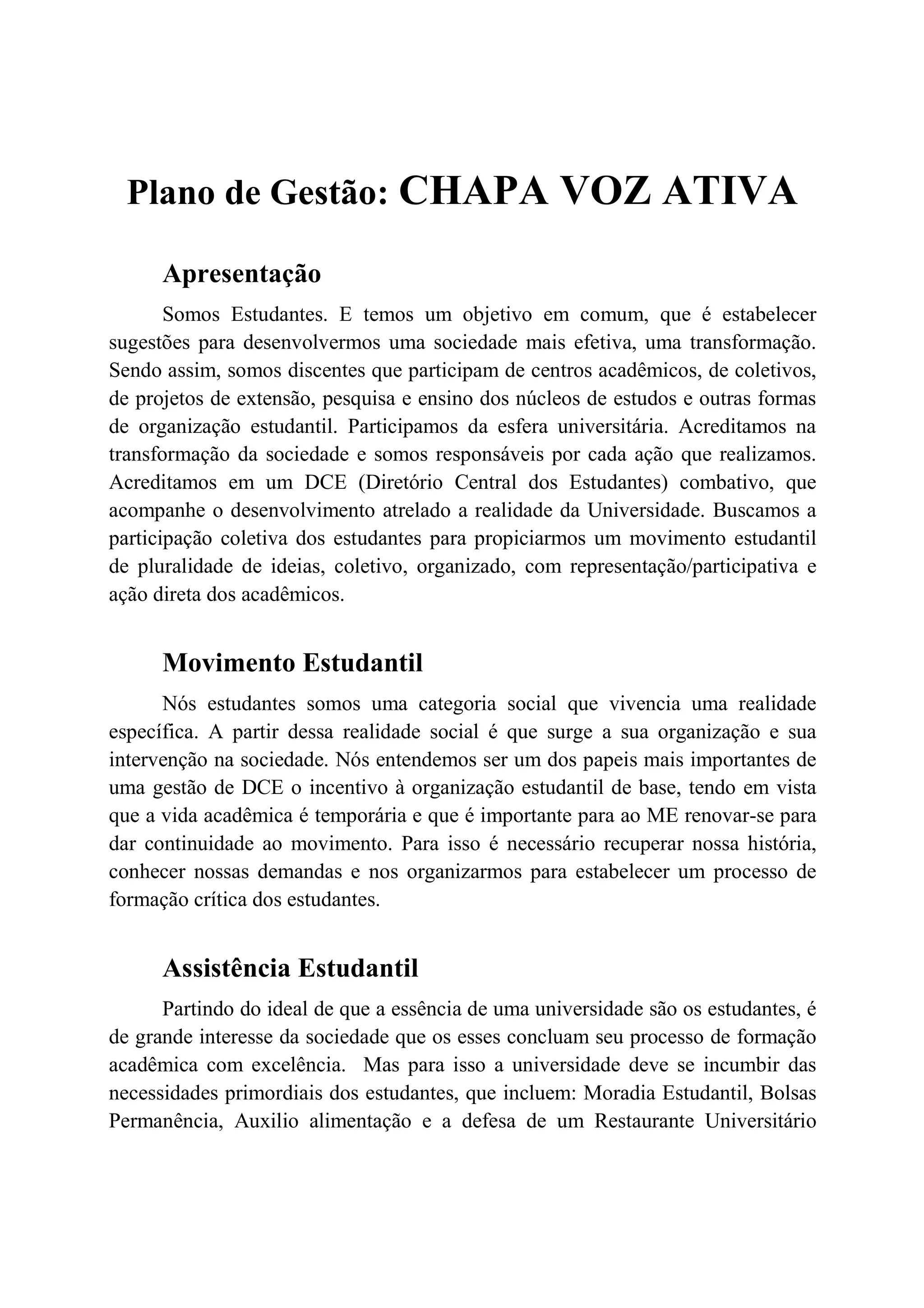 Este documento apresenta o plano de gestão da Chapa Voz Ativa para o Diretório Central dos Estudantes (DCE) da Universidade Federal da Grande Dourados (UFGD). Ele aborda objetivos como melhorar a assistência estudantil, a infraestrutura da universidade, o transporte e as atividades culturais e esportivas para os estudantes.