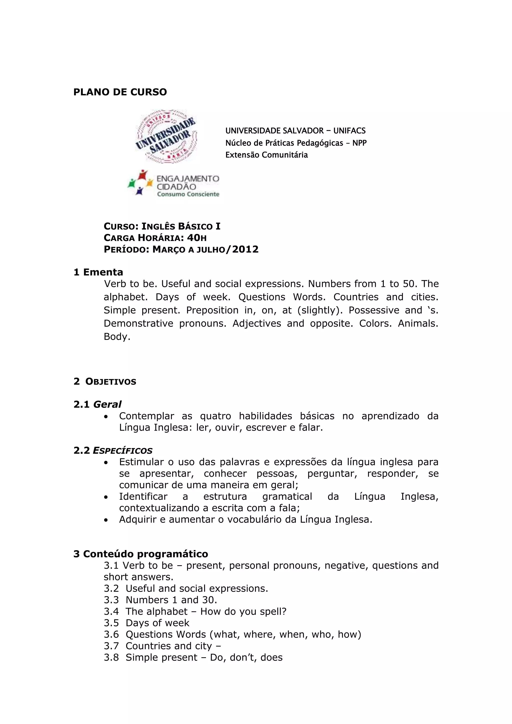 Este plano de curso descreve um curso básico de inglês oferecido pela Universidade Salvador - UNIFACS. O curso ensinará verbos, números, dias da semana, perguntas, países, cores e mais durante 40 horas. O objetivo é desenvolver as quatro habilidades básicas da língua inglesa e aumentar o vocabulário dos alunos por meio de interação, exercícios e avaliações.
