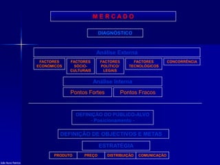 O documento apresenta os principais elementos de um plano de marketing, incluindo a análise do ambiente interno e externo, a definição do público-alvo, o posicionamento da marca e as estratégias de produto, preço, distribuição e comunicação. O objetivo é diagnosticar as forças e fraquezas da empresa e identificar oportunidades e ameaças para desenvolver um plano estratégico que maximize o sucesso do negócio.