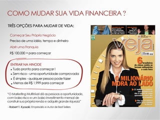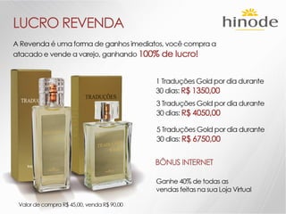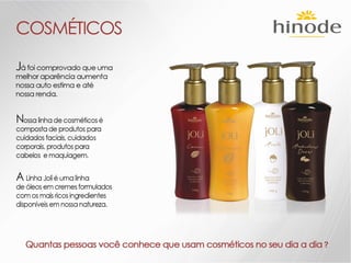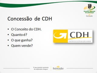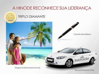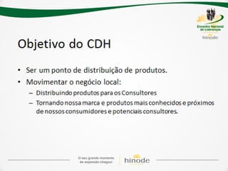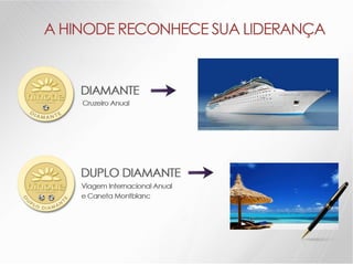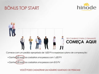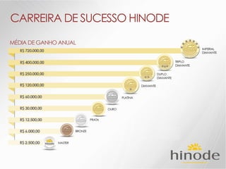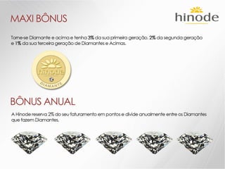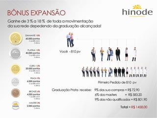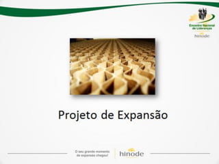 O documento descreve os detalhes de um projeto de expansão de uma empresa de nome Hinode, incluindo novos kits de produtos, regras de graduação, bônus e reconhecimentos. Ele também fornece detalhes sobre investimentos em fábrica, logística, sistema e comunicação para apoiar o crescimento da empresa.