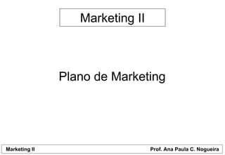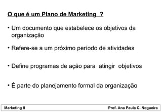 O documento discute os principais pontos de um plano de marketing, incluindo uma análise da situação interna e externa da empresa, definição de objetivos e estratégias de marketing. A análise interna avalia fatores como o porte e características da empresa, enquanto a externa considera clientes, concorrentes e ambiente. Isso permite identificar pontos fortes, fracos, oportunidades e ameaças e traçar objetivos quantitativos e qualitativos, a serem atingidos por meio de estratégias de marketing.