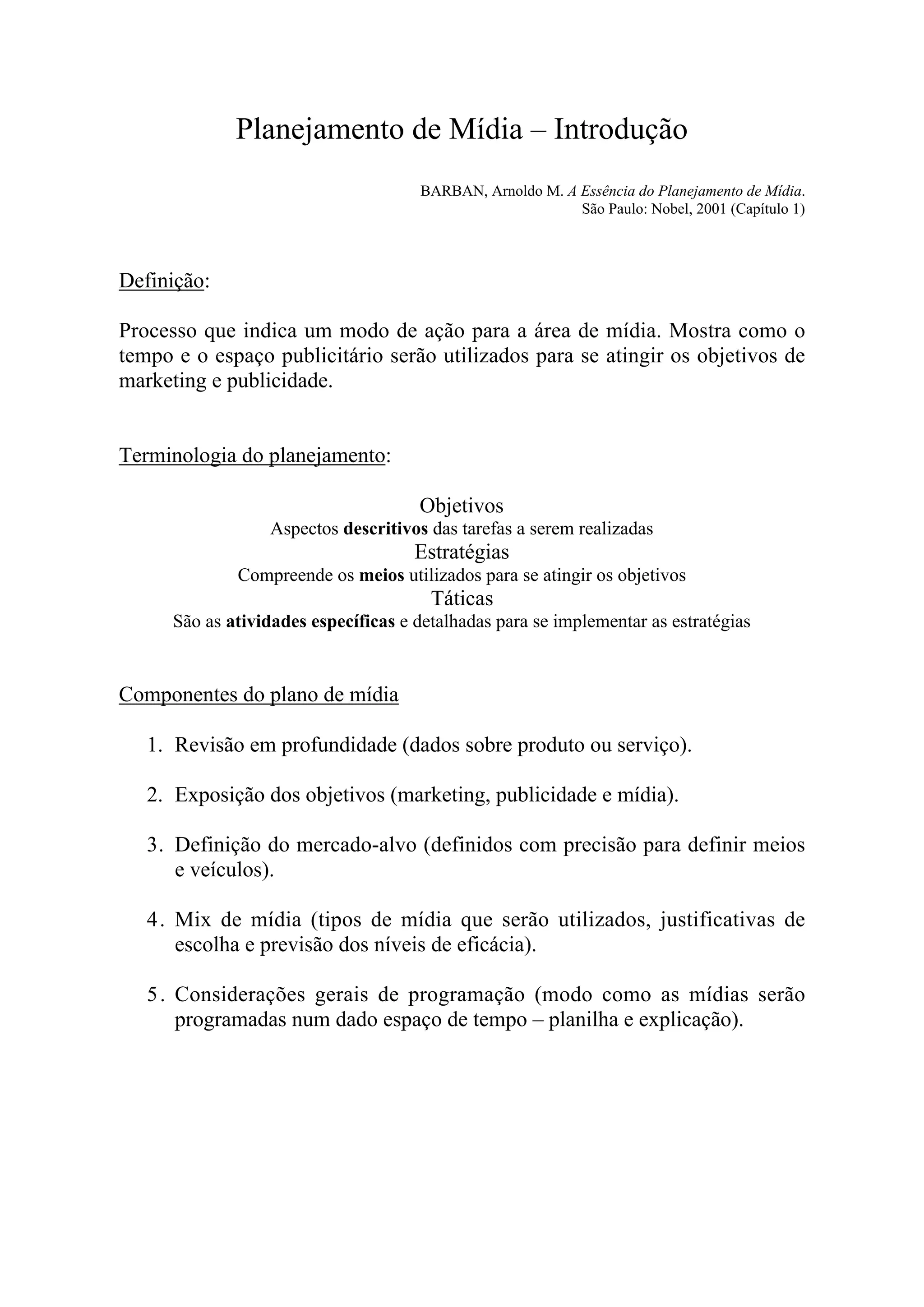 O documento descreve o planejamento de mídia, definindo-o como um processo que indica como o tempo e espaço na mídia serão utilizados para atingir objetivos de marketing e publicidade. Ele explica a terminologia do planejamento incluindo objetivos, estratégias e táticas, e lista os cinco componentes principais de um plano de mídia. Finalmente, descreve o processo de tomada de decisão em mídia.