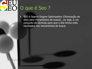 O documento apresenta um plano de negócios para uma empresa de otimização de sites para mecanismos de busca (SEO) chamada SeuSeo. O plano descreve o público-alvo, a equipe, as estratégias de marketing e divulgação, o plano financeiro e tecnológico, e conclui que o plano é viável e rentável.