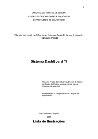 1. O documento descreve o plano de projeto de software para o sistema DashBoard TI, que tem como objetivo auxiliar o gestor de TI do Hospital Universitário de Sergipe no controle de atividades e recursos.