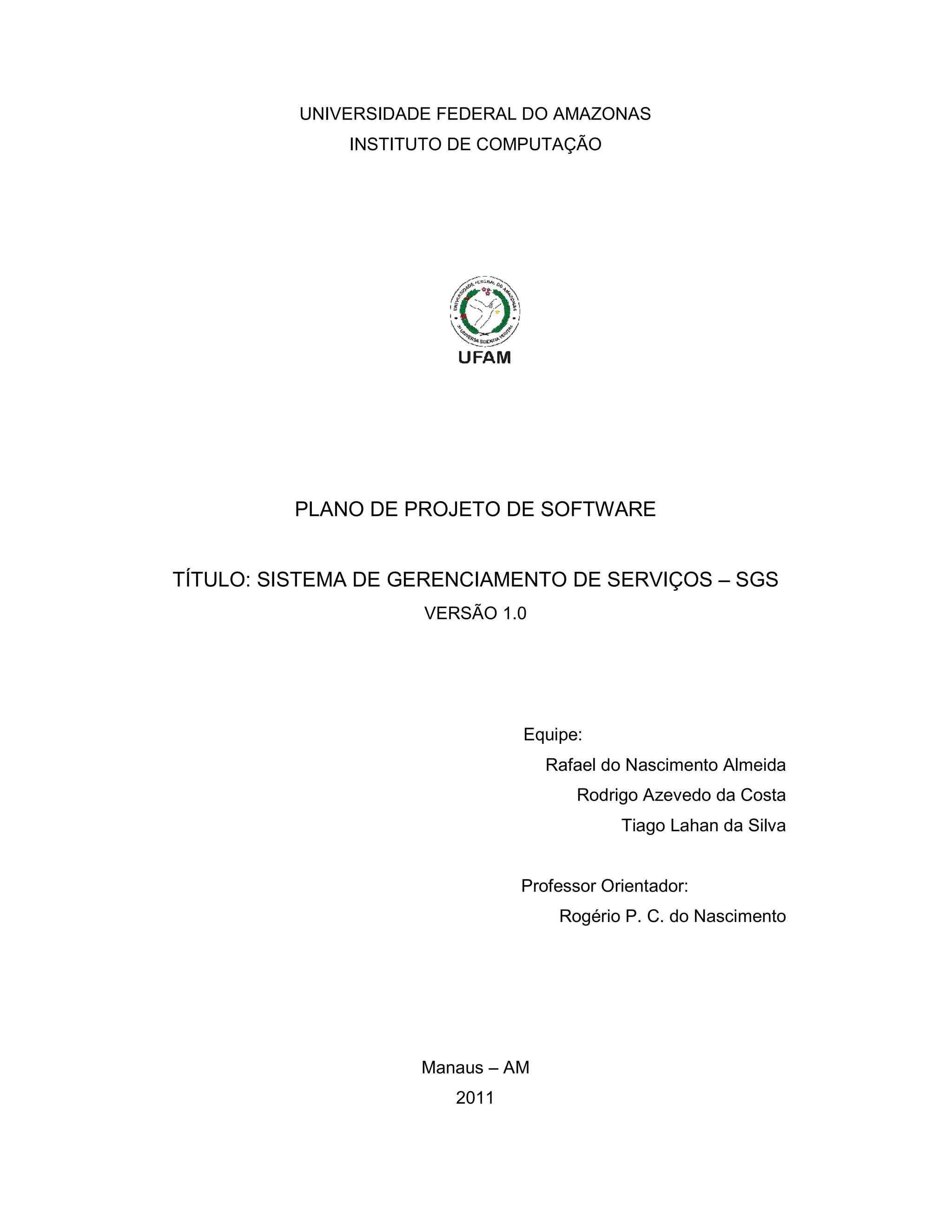 Este documento apresenta o plano de projeto de um sistema de gerenciamento de serviços (SGS) para a Universidade Federal do Amazonas (UFAM). O SGS visa melhorar o controle e acompanhamento de requisições de serviços, permitindo o cadastro eletrônico de requisições, o acompanhamento online do status das atividades solicitadas e a emissão de relatórios. O plano detalha a estimativa de esforço e prazo do projeto utilizando a técnica de Lorenz & Kidd, identifica os principais riscos e define