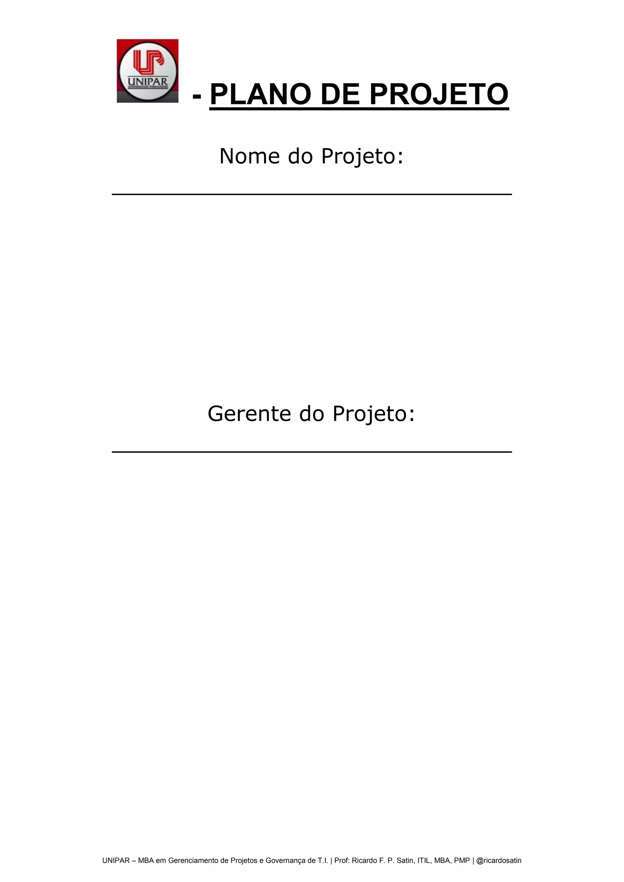 Nome do Projeto:<br/>______________________________<br /> SUBJECT \* MERGEFORMAT <br /> <br />Gerente do Projeto: <br />______________________________<br />Conteúdo<br /> TOC \o \" 1-3\" \h \z 1.Sumário PAGEREF _Toc296848991 \h 3<br />2.O Projeto PAGEREF _Toc296848992 \h 3<br />3.Objetivos PAGEREF _Toc296848993 \h 3<br />4.Demanda (porque fazer o projeto?) PAGEREF _Toc296848994 \h 3<br />5.Plano do projeto PAGEREF _Toc296848995 \h 3<br />5.1Sumário do projeto PAGEREF _Toc296848996 \h 3<br />5.1.1Premissas PAGEREF _Toc296848997 \h 4<br />5.1.2Restrições PAGEREF _Toc296848998 \h 4<br />5.2Plano de Gerenciamento do Escopo do Projeto PAGEREF _Toc296848999 \h 4<br />5.2.1Alterações no Escopo do Projeto PAGEREF _Toc296849000 \h 4<br />5.2.2Controle integrado de mudanças PAGEREF _Toc296849001 \h 4<br />5.2.3Metodologia de trabalho PAGEREF _Toc296849002 \h 4<br />5.3Plano de Gerenciamento do Tempo PAGEREF _Toc296849003 \h 5<br />5.3.1Cronograma do projeto PAGEREF _Toc296849004 \h 5<br />5.4Plano de Gerenciamento do Custo PAGEREF _Toc296849005 \h 5<br />5.5Plano de Gerenciamento da Qualidade PAGEREF _Toc296849006 \h 5<br />5.6Plano de Gerenciamento dos Recursos Humanos PAGEREF _Toc296849007 \h 5<br />5.7Plano de Gerenciamento da Comunicação PAGEREF _Toc296849008 \h 6<br />5.8Plano de Gerenciamento dos Riscos do Projeto PAGEREF _Toc296849009 \h 6<br />5.9Plano de Gerenciamento das Aquisições do Projeto PAGEREF _Toc296849010 \h 6<br />6.Aprovadores do Documento PAGEREF _Toc296849011 \h 6<br />Sumário<br />Um breve descritivo sobre o que é o projeto.<br />O Projeto<br />O que é o projeto? Descrever aqui<br />Objetivos<br />Descreve aqui os objetivos do projeto.<br />Demanda (porque fazer o projeto?)<br />Problemas que se pretende resolver:<br />Alguns exemplos:<br />Benefícios esperados:<br />Pontos de medida:<br />Plano do projeto<br />Sumário do projeto<br />Apresente aqui um resumo geral do plano do projeto, como ele está organizado e o que podemos encontrar e como pode nos ajudar.<br />Premissas<br />Pontue todas as premissas que você classifica como importante para que o projeto possa acontecer.<br />Restrições<br />Pontue todas as restrições apresentadas pelo cliente ao projeto.<br />Plano de Gerenciamento do Escopo do Projeto<br />Com base do project charter e com base no escopo identificado, descreva aqui todo o escopo do projeto. Incluindo produto, serviço, atividades de terceiros, atividade inclusive do cliente.<br />Alterações no Escopo do Projeto<br />Controle de alteração<br />Descrever aqui como será o controle das alterações do escopo do projeto.<br />Acompanhamento do Escopo<br />Descreva aqui como este escopo do projeto será acompanhado, evitando erros e alterações desnecessárias. <br /> <br />Controle integrado de mudanças<br />Como serão controladas as mudanças no projeto? Como elas serão solicitadas? Quem fará análise, quanto tempo para resposta, o que deve ser avaliando em cada solicitação de mudança, onde elas serão aprovadas (reunião de progresso?), e caso hajam situações emergenciais? Quem serão os membros do board que cuidarão das mudanças, como devem ser documentadas após aprovação ou reprovação...<br />Metodologia de trabalho<br />Descreva aqu como será a metodologia de trabalho a ser adotada. Exemplo. As necessidades serão primeiramente clarificadas, após isto iremos trabalhar no desenvolvimento onde um dia por semana teremos a disposição integral ao trabalho por parte de todos os colaboradores..... será possivel o uso de sábado, hora extra, banco de horas???<br />Plano de Gerenciamento do Tempo<br />Apresente um descritivo do que estaremos vendo no cronograma... estaremos vendo até nível de tarefa? ...<br />Cronograma do projeto<br />Apresente o cronograma do projeto, esta é a linha base do cronograma do projeto.<br />Marcos do Projeto<br />É importante apresentar uma relação dos marcos com suas datas para facilitar o entendimento das entregas.<br />Acompanhamento do cronograma<br />Como será avaliado o cronograma e seus indicadores de desempenho? Quais os indicadores de desempenho de prazo e custo serão considerados?<br />Plano de Gerenciamento do Custo<br />Apresente o plano de gerenciamento do custo do projeto, quais indicadores, quando teremos a análise feita...<br />Plano de Gerenciamento da Qualidade<br />Apresente o plano de gerenciamento da Qualidade. Quais os critérios de qualidade, onde serão medidos, como serão medidos, quais as ferramentas de controle...<br />Plano de Gerenciamento dos Recursos Humanos<br />Apresente o plano de gerenciamento dos recursos humanos para o projeto.<br />Plano de Gerenciamento da Comunicação<br />Apresente o plano de gerenciamento da comunicação para o projeto.<br />Plano de Gerenciamento dos Riscos do Projeto<br />Apresente o plano de gerenciamento dos riscos para o projeto.<br />Plano de Gerenciamento das Aquisições do Projeto<br />Apresente o plano de gerenciamento de aquisições necessárias para o projeto.<br />Aprovadores do Documento<br />DataStakeholderDepartamento<br />