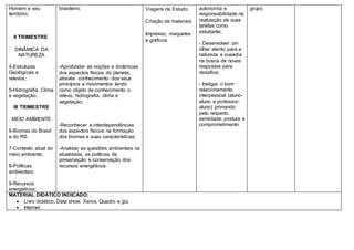 Este documento apresenta três planos de trabalho para o componente curricular de Geografia no 1o, 2o e 3o ano do ensino médio. Cada plano descreve os principais conteúdos a serem abordados em cada trimestre, as atividades propostas, os resultados esperados e os materiais didáticos indicados. Os conteúdos incluem tópicos como espaço geográfico, dinâmica da natureza, meio ambiente, espaço rural e urbano, industrialização e globalização.