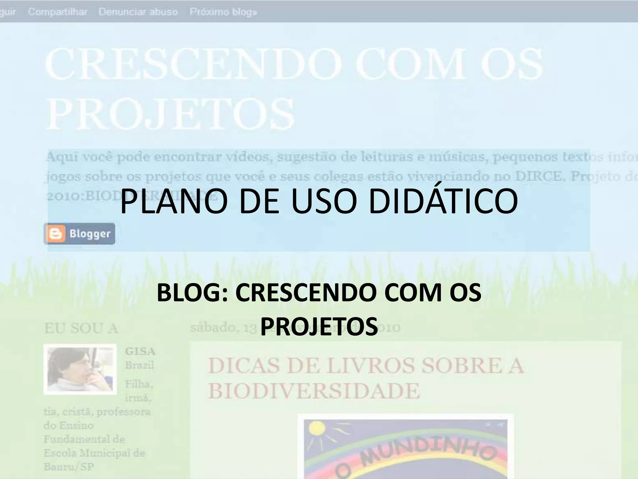 O blog 'Crescendo com os Projetos' foi criado para ser um espaço didático dinâmico para os alunos da EMEF Dirce B. G. de Azevedo em Bauru/SP, onde podem acessar recursos de aprendizagem relacionados a projetos semestrais. Os objetivos incluem oferecer sugestões de leitura e facilitar o acesso a informações, além de servir como local para postagens e troca de experiências. A avaliação do sucesso do blog será determinada pela apropriação dos alunos que acessarão e contribuirão com o conteúdo.