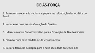 O documento propõe 5 ideias-força para um novo governo: 1) Promover a soberania nacional e popular através da democracia e participação popular. 2) Iniciar uma nova era de direitos, como gênero e raça. 3) Liderar um novo pacto federativo para promover direitos sociais na saúde, educação e segurança. 4) Promover um novo modelo de desenvolvimento sustentável. 5) Iniciar a transição ecológica para uma nova sociedade sustentável no século 21.